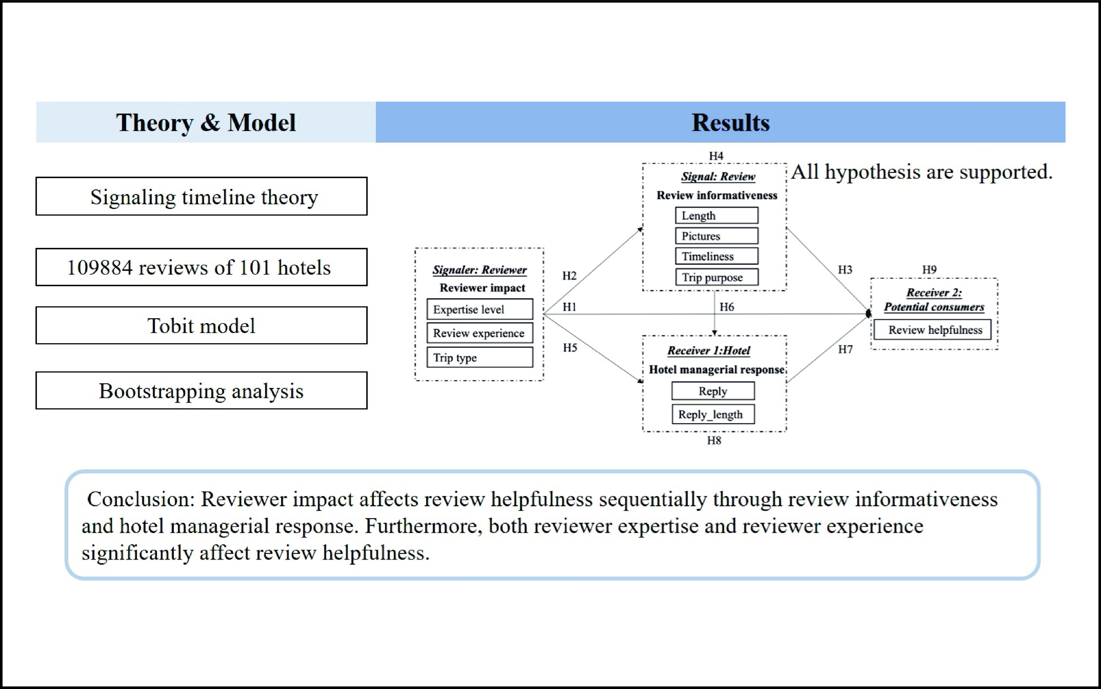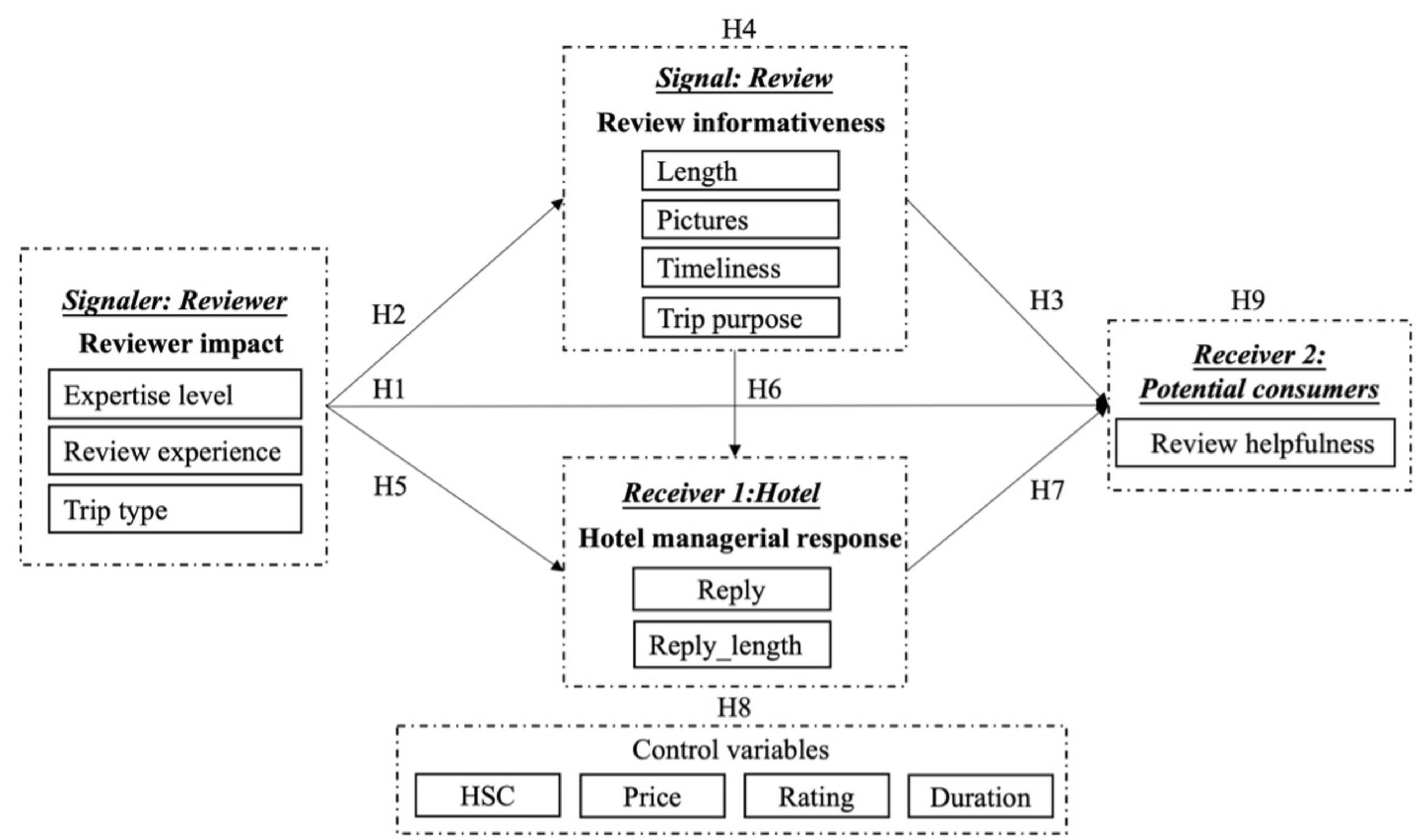 Many existing studies have considered the factors influencing review helpfulness, mainly focusing on reviewer impact, review informativeness, and managerial response, based on signaling theory. However, previous studies have simply regarded these factors as independent signals, thus ignoring their in-depth transmission and reception processes. The conclusions about the impact of reviewers on review helpfulness are also inconsistent due to the inaccurate measurement of variables. To fill the above gaps, we followed the signaling timeline theoretical framework used in signaling theory and employed a bootstrapping analysis to examine how reviewer impact, review informativeness, and hotel managerial responses interact to influence review helpfulness. In this study, we used a unique dataset that included official labels from one leading online travel agency. The results show that reviewer impact may affect review helpfulness sequentially through review informativeness and hotel managerial response. Furthermore, by using official labels, both reviewer expertise and reviewer experience significantly affect review helpfulness. Finally, we discussed the theoretical and practical implications of these findings.